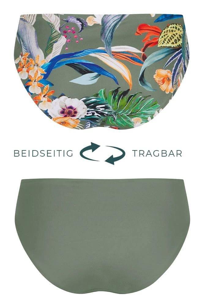 Bikinihose Krabi von Amoena überrascht mit wunderschönem Blütendesign auf olivfarbenem Grund. Raffiniertes Detail: Badehose Krabi kann als Wende-Badehose auch unifarben in Oliv getragen werden. Weich schmiegt sich das hochwertige Material an Ihre Haut. Das hochwertige recycelte Material mit ausgezeichnetem UV-Schutz 50+ bietet optimalen Schutz für empfindliche Haut. LYCRA® XTRA LIFE™ Elasthan sorgt für langanhaltende Formbeständigkeit, mit hoher Chlorresistenz. Die vielseitige Bikinihose ist hüfthoch geschnitten, der Beinausschnitt ist moderat.