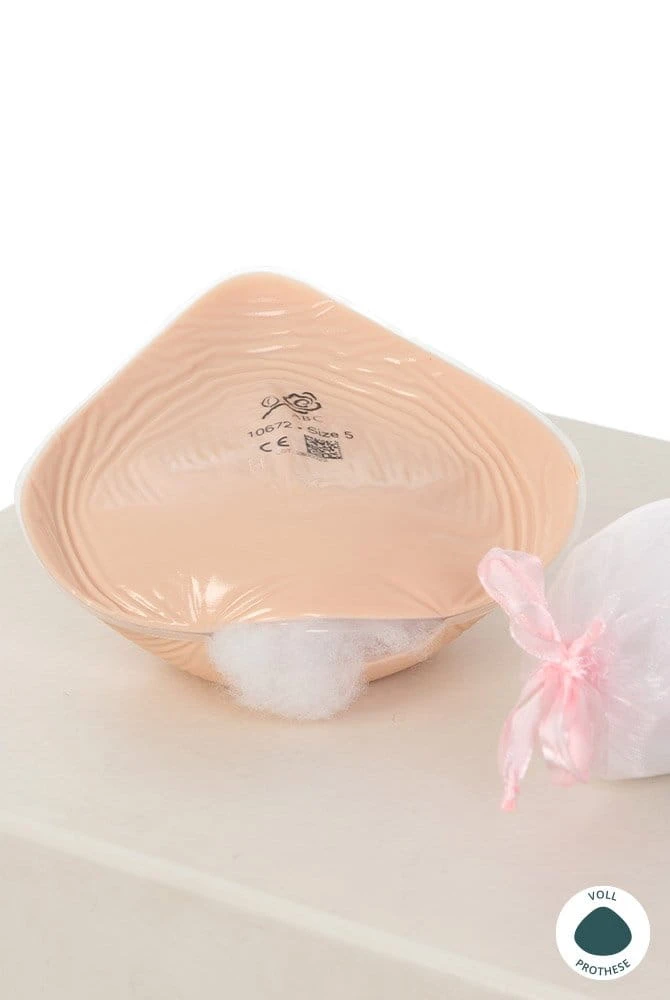 Die symmetrische Brustprothese ist aus einschichtigem Silikon gefertigt und schmiegt sich mit dem weichen Fiberfill perfekt und leicht an Ihre Brustwand. Die beliebte Vollprothese ist hygienisch und leicht zu reinigen. Aufgrund der gleichmäßigen symmetrischen Deltaform kann die Brustprothese von ABC rechts oder links getragen werden.